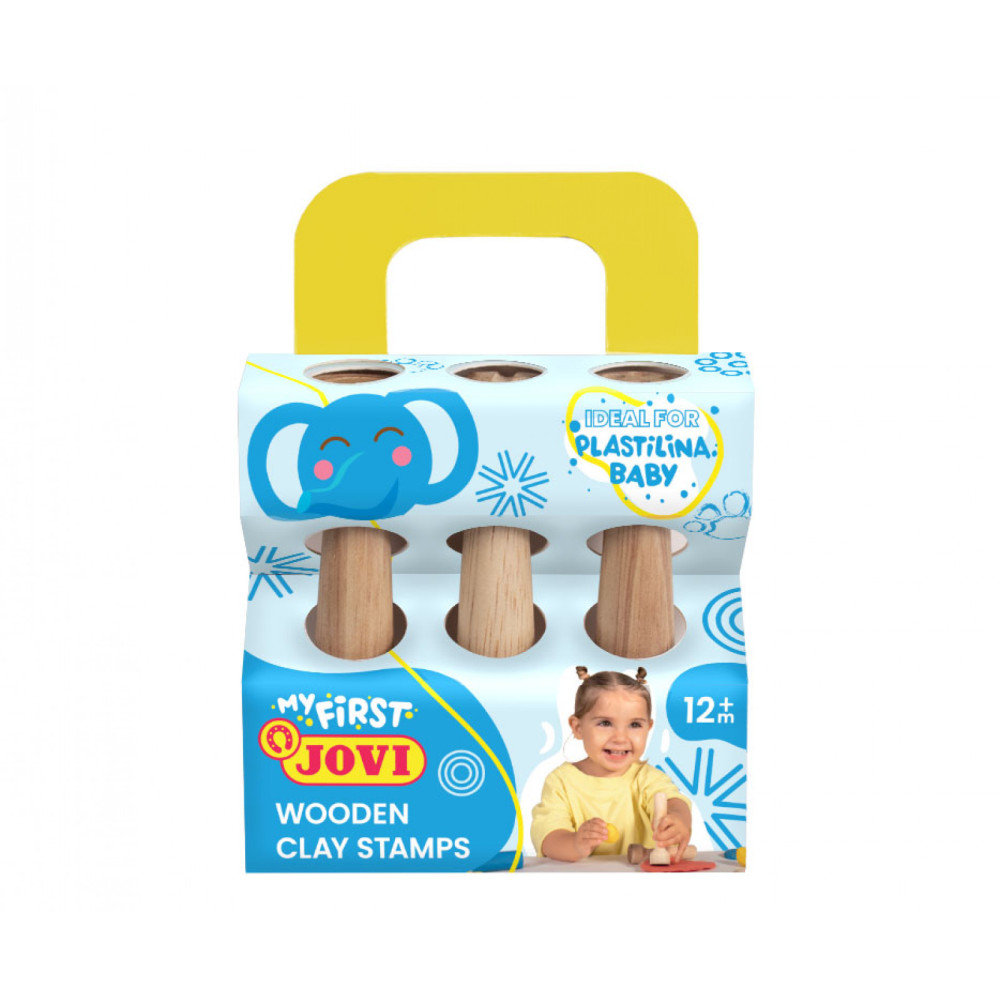 Ten zestaw zawiera trzy drewniane stempelki z różnymi wzorami, idealne do użycia z plasteliną dla najmłodszych.