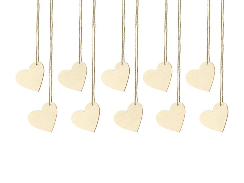 Wizytówki na stół Serca wykonane z drewna, zestaw zawiera wizytówki oraz ok. 2 m lnianego sznurka, wymiary ok. 6 x 5 cm.(1 op. / 10 szt.)