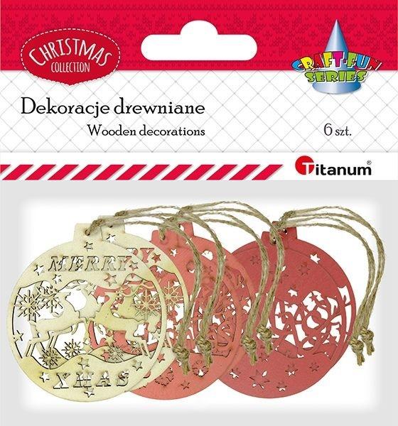 Zestaw drewnianych zawieszek. Sklejka o grubości 25 mm. Wzory: bombki. Wymiary: 70-72 mm. Jutowe sznurki. Opakowanie 6 szt.