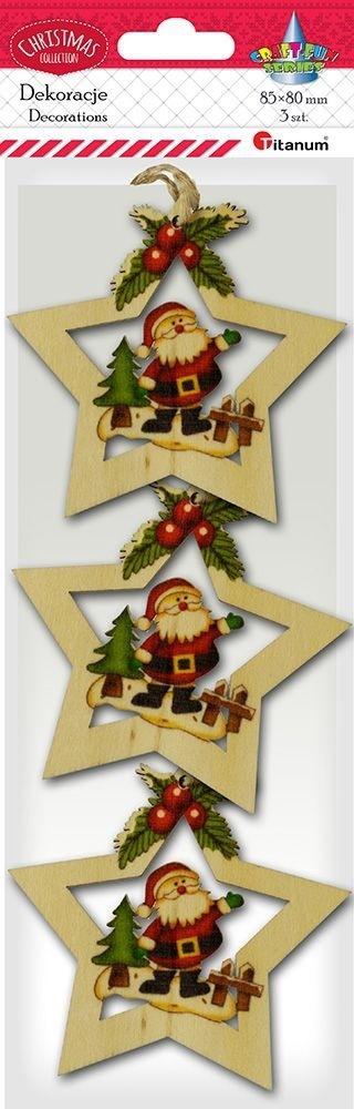 Dekoracja z drewna, do zawieszenia. Gwiazda z Mikołajem. Wymiary: 85 x 80 mm. 3 szt. Sklejka 2,5 mm.