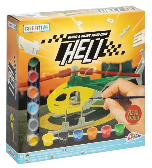 Drewniany helikopter konstrukcyjny, w zestawie 6 farb i pędzelek. Wymiary opakowania: 26 cm x 5 cm x 26 cm. Helikopter do złożenia z drewnianych puzzli, efekt 3D. Drewniane elementy można zostawić surowe, bądź pomalować je załączonymi do zestawu farbami. W opakowaniu 6 kolorów farb i pędzelek. Stworzony własnoręcznie helikopter może posłużyć do zabawy lub posłużyć jako dekoracja kolekcjonerska. Przeznaczone dla dzieci powyżej 5 roku życia.