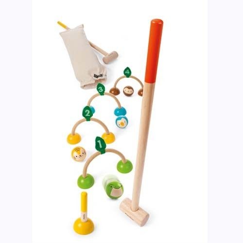 Gra w krokieta przeznaczona jest dla młodszych, jak również starszych dzieci. Idealna do zabawy w domu z przyjaciółmi na przyjęciu urodzinowym lub w czasie pikników w ogrodzie albo w lesie. Zestaw zawiera 4 drewniane kulki, 2 młotki, 4 bramki i końcowe stanowisko. Wymiary: 40 x 80 x 52 cm Firma Plan Toys należy do światowej czołówki pod względem produkcji ekologicznych zabawek. Jako pierwsza zaczęła wykorzystywać do produkcji naturalne, ponownie przetworzone drewno kauczukowe. Dba także o to, aby stosowane farby, kleje, jak również opakowania zabawek oraz same metody ich produkcji były w jak największym stopniu przyjazne środowisku.