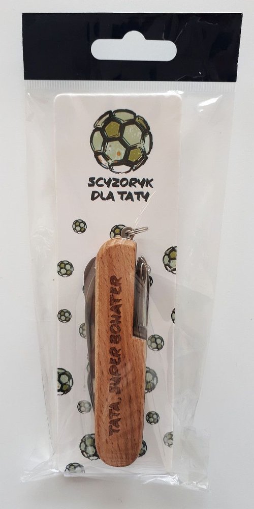 * drewniany, wielofunkcyjny scyzoryk z wygrawerowaną dedykacją Tata, Super Bohater