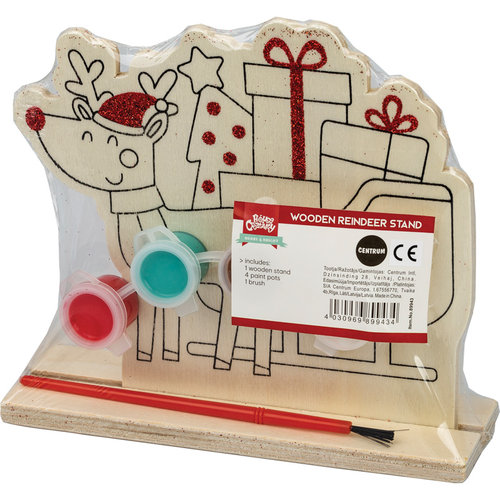 Klimatyczna świąteczny stojak w kształcie renifera z saniami pełnymi prezentów. Wymiar: 14,5cm x 12cm x 5 cm. Zawiera: 4 pojemniki z farbą oraz pędzelek.