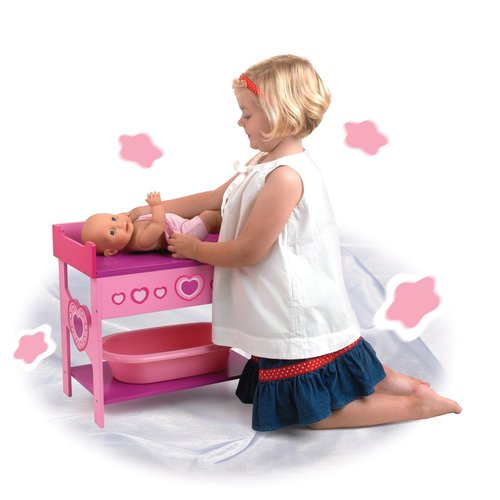 Drewniany stół do przebierania dla lalek z motywami w kształcie serca. Stół posiada wannę w zestawie. Idealny dla lalek aż do 46 cm.