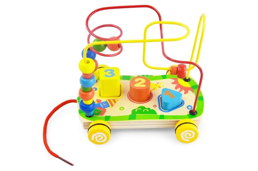FUNKCJE: LABIRYNT Z KORALIKAMI, SORTER Z 3 KLOCKAMI, SZNURECZEK DO CIĄGNIĘCIA, WYM. OPK: 21,8 X 22 X 2,8 CM., 18M+