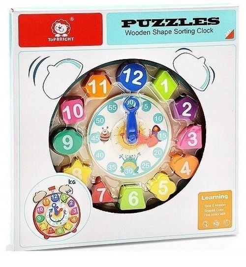 Zegar drewniany firmy Top Bright to idealny zestaw do nauki godzin, liczb i kształtów dla najmłodszych. Zawartość: zegar, klocki – godziny w różnych kształtach i kolorach. Wiek: 2+