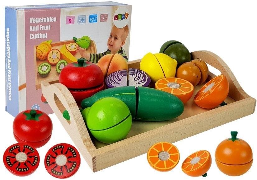 Całość wykonana jest z drewna, nieszkodliwych dla dziecka, a dzięki temu trwałość zabawki jest większa. W zestawie znajdują się owoce i warzywa przyczepione do siebie rzepem, dlatego łatwo można je pokroić, a potem złączyć je razem.