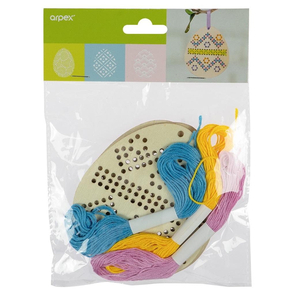 Zestaw kreatywny do samodzielnej dekoracji drewnianej pisanki. Drewniane jajko posiada otwory, przez które należy przewlekać mulinę tworząc kolorowe wzory jak w hafcie. W zestawie znajdują się trzy drewniane bazy w kształcie jajka o rozmiarze około 11,5 x 9,5 cm, trzy kolory muliny oraz plastikowa igła do przewlekania sznurka.