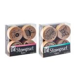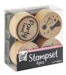 Zestaw 4 sztuk stempli drewnianych. Dostępne w 2 wariantach, z symbolami urodzinowego przyjęcia lub kwiatowe. Stemple to idealny gadżet do zabawy w Pocztę albo do ozdabiania swoich rysunków, czy kartek okolicznościowych. Przeznaczone dla dzieci powyżej 3 roku życia