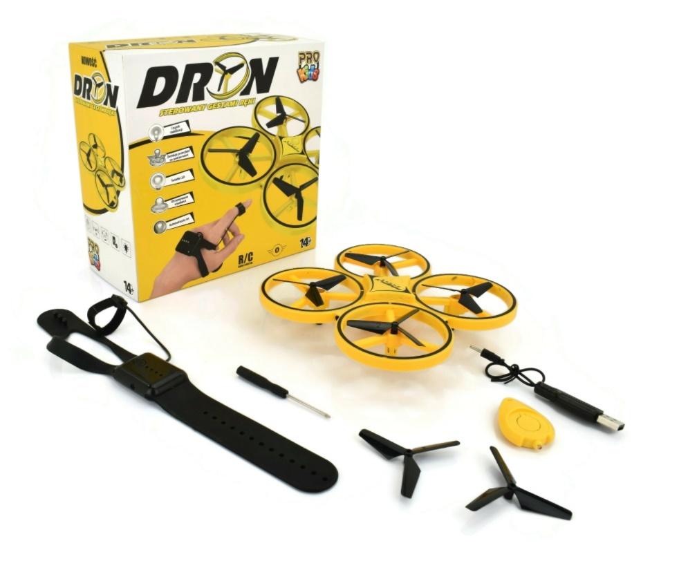 Dron quadrokopter sterowany za pomocą gestów ręki. Dzięki specjalnej opasce zakładanej na dłoń dron czyta nasze ruchy ręką i odwzorowuje je na zabawce. Super Zabawa i prosta kontrola nad pojazdem zapewni długie godziny zabawy. W kontrolerze dołączono przycisk startu nakładany na palec