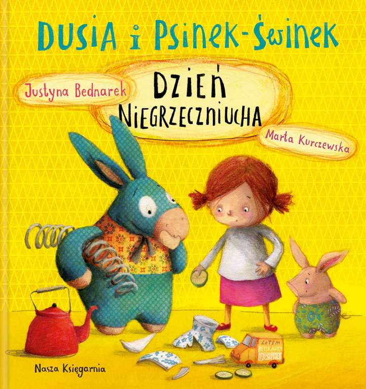 Dusia jest pewna, że dziś wypada Dzień Niegrzeczniucha! Tak po prostu musi być, bo nawet mama jest naburmuszona, a w domu pojawia się tajemniczy piegowaty rudzielec – wujek Kacper, który okropnie łobuzuje. Wypija Dusi jej ulubiony sok, chowa domownikom kapcie, a potem tłucze śliczny wazonik. Ale to jeszcze nie koniec – na ulicy jakiś pan w żółtej furgonetce wymyśla tatusiowi od osłów, a w przedszkolu Patryk nazywa Monikę kapuścianą pupą. Wszyscy sobie dokuczają, a już najbardziej mama i jej piegowaty kuzynek! Ale bez obaw! Psinek-Świnek i jego kolega Osioł Patentowany znajdą na to jakiś sposób! O SERII „Dusia i Psinek-Świnek” to seria książek dla najmłodszych o rezolutnej dziewczynce, która poznaje świat wokół siebie razem z mamą, tatą, najlepszym przyjacielem z przedszkola Tomkiem, a przede wszystkim ze swoim ukochanym Psinkiem-Świnkiem. Musicie jednak wiedzieć, że Psinek-Świnek nie tylko dodaje Dusi otuchy w trudnych życiowych momentach. Pluszak ma także własne tajemnice… Justyna Bednarek jest jedną z najpopularniejszych polskich autorek piszących dla dzieci. Jej „Niesamowite przygody dziesięciu skarpetek”, zilustrowane przez Daniela de Latoura, otrzymały wiele ważnych nagród oraz nominacji, a także znalazły się na liście lektur szkolnych. W Wydawnictwie „Nasza Księgarnia” Justyna Bednarek opublikowała między innymi książkę „Pan Stanisław odlatuje” – zilustrowaną przez Pawła Pawlaka poetycką opowieść, która z pogodą przedstawia temat pożegnania z bliską osobą i pomaga małym czytelnikom uporać się ze stratą. Pisarka mieszka na warszawskich Bielanach, a dom dzieli z dziećmi, psami, myszoskoczkami, kurami oraz papugą. Marta Kurczewska zamiast Psinka-Świnka ma wąsatą muzę – czarną kotkę zwaną Panią Prezes. Pierwszą wystawę jej prac zorganizował tata… dla mamy. I choć wernisaż był wielkim wydarzeniem, to już murale młodej artystki wywołały w rodzicach mieszane uczucia. Obecnie ilustratorka nie musi jednak malować po ścianach. Jest dumną właścicielką ogromnego stołu do pracy, na którym do woli maże, bazgrze, chlapie, wydziera i dokleja.
