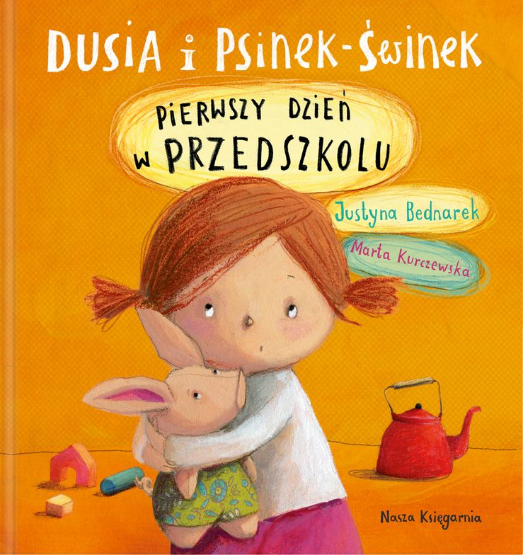 „Dusia i Psinek-Świnek” to seria książek o dziewczynce, która poznaje świat wokół siebie razem z mamą, tatą, najlepszym przyjacielem Tomkiem, a przede wszystkim z Psinkiem-Świnkiem, który ma także własne tajemnice! Magdalena Felicja, dla przyjaciół Dusia, wcale nie wie, czy chce iść do tego całego przedszkola. A jak wiadomo, na odwagę najlepiej robią pluszaki, więc mama szyje córeczce przytulankę. Świnkę w spodniach w kwiatki! Dusia z początku jest zdziwiona. Przecież mówiła mamie wyraźnie (no, może tylko trochę ziewaaaaając), że chce psiaka. Nie prosiaka! Lecz gdy tylko Psinek-Świnek pojawia się na świecie, już wiadomo, że on i Dusia będą nierozłączni. W przedszkolu Dusia poznaje Monikę, która gryzie, Joasię, która boi się ubrudzić, i Tomka, który zamiast zabawki przyniósł ze sobą prawdziwy czerwony czajniczek! Taki czajniczek świetnie się nada na domek dla Psinka-Świnka, który przeżyje w środku swoje własne zwariowane przygody... Po namyśle Dusia dochodzi do wniosku, że chyba pójdzie JESZCZE RAZ do tego całego przedszkola… Justyna Bednarek jest romanistką, dziennikarką i autorką książek dla dzieci. Jej „Niesamowite przygody dziesięciu skarpetek”, zilustrowane przez Daniela de Latoura, otrzymały wiele ważnych nagród oraz nominacji (w tym Warszawską Nagrodę Literacką oraz nagrodę Przecinek i Kropka), a także znalazły się na liście lektur szkolnych. Pisarka mieszka na warszawskich Bielanach, a dom dzieli z dziećmi, psami i myszoskoczkami. Marta Kurczewska zamiast Psinka-Świnka ma wąsatą muzę – czarną kotkę zwaną Panią Prezes. Pierwszą wystawę jej prac zorganizował tata… dla mamy. I choć wernisaż był wielkim wydarzeniem, to już murale młodej artystki wywołały w rodzicach mieszane uczucia. Obecnie ilustratorka nie musi jednak malować po ścianach. Jest dumną właścicielką ogromnego stołu do pracy, na którym do woli maże, bazgrze, chlapie, wydziera i dokleja.
