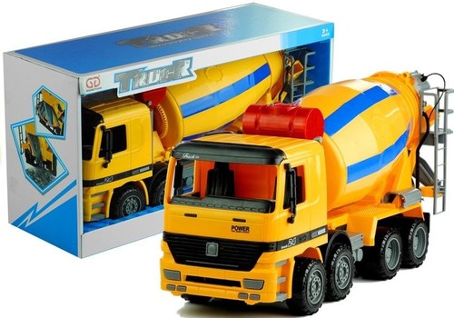 rezentowany pojazd odznacza się wysoką jakością wykonania, produkcją z najwyższej jakości atestowanych materiałów, a przede wszystkim dokładnym odwzorowaniem wszelkich detali wchodzących w skład wyposażenia. Podczas projektowania zabawki na pierwszym miejscu postawiono bezpieczeństwo maluchów, dlatego konstrukcja betoniarki pozbawiona jest ostrych elementów, natomiast posiada ruchome części, które pobudzają wyobraźnię dziecka, równocześnie zachęcając do zabawy. Zabawkowa betoniarka składa się z szeregu zalet. Osadzona jest na ruchomych, bieżnikowanych kołach, dzięki czemu dziecko może używać jej na różnego rodzaju powierzchniach. Kabina kierowcy posiada otwartą przednią szybę oraz boczne okna, dzięki czemu maluch w łatwy sposób może umieścić kierowcę i pasażera na fotelach. Kierownica znajdująca się w kabinie, a także lusterka osadzone po jej obu stronach, są ruchomymi elementami. W tylnej części pojazdu znajduje się ruchoma, obrotowa gruszka, wyposażona w przekręcaną rynnę. W bocznej części umieszczona jest drabina oraz sieć przewodów, łączących się z wlewem. Zabawka wykonana jest w bardzo realistycznym stylu, posiada charakterystyczne dla tego typu pojazdów naklejki, a także szereg imitacji istotnych detali. Zabawka posiada napęd typu friction, umożliwiający samodzielną jazdę betoniarki. Betoniarka wykonana jest z tworzywa najwyższej jakości, posiada certyfikat CE. Zabawka przeznaczona jest dla dzieci w wieku 3lat. Zapakowana jest w estetyczne, kolorowe pudełko z witrynką, dzięki czemu rewelacyjnie posłuży za prezent. Wymiary zabawki: - 40 cm x 12,5 cm x 18 cm.
