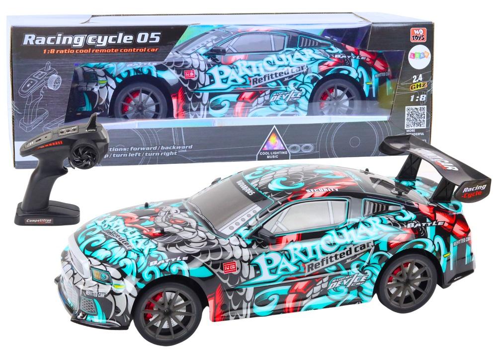 Duże Auto Sportowe Zdalnie Sterowane RC 1:8 Światła Dźwięki Graffiti Duży samochód sportowy zdalnie sterowany w skali 1:8 to imponujący model, który przyciąga uwagę swoim eleganckim wyglądem i zaawansowanymi funkcjami. Zaprojektowany na wzór prawdziwego auta sportowego, samochód ten jest utrzymany w stylowej kolorystyce niebiesko-czerwonego graffiti, co nadaje mu nowoczesny i dynamiczny wygląd. Dzięki dbałości o detale i realistycznemu designowi, model ten prezentuje się niezwykle imponująco. Wykonany z tworzywa odpornego na uszkodzenia, samochód zapewnia długotrwałą zabawę i jest odporny na intensywną eksploatację. Elastyczna konstrukcja sprawia, że pojazd wytrzymuje zderzenia i upadki, co jest szczególnie ważne podczas dynamicznej jazdy. Samochód wyposażony jest w efekty świetlne i dźwiękowe, które dodają realizmu i potęgują wrażenia z jazdy. Te efekty nie tylko wzbogacają doświadczenie użytkownika, ale także przyciągają uwagę i dodają autentyczności całemu modelowi. Sterowanie samochodem odbywa się za pomocą zaawansowanego pilota 2.4 G, który zapewnia pełen zakres ruchów i precyzyjną kontrolę nad pojazdem. Dzięki temu użytkownik może łatwo manewrować samochodem, wykonując ruchy, takie jak skręty, cofanie czy przyspieszanie. Pilot 2.4 G gwarantuje stabilne połączenie i szybkie reakcje, co jest kluczowe podczas intensywnych wyścigów i zabaw. Ten zdalnie sterowany samochód sportowy to idealny wybór dla miłośników motoryzacji, którzy cenią sobie realistyczne modele i zaawansowane funkcje. To doskonały sposób na spędzenie czasu, rozwijanie umiejętności manualnych i koordynacji, a także na przeżycie niezapomnianych emocji podczas dynamicznych wyścigów i zabaw. Auto zasilane jest na akumulator 7.4V, który jest elementem zestawu. Do akumulatora dołączona jest ładowarka. Pilot zasilany jest na baterie 2x 1.5V AA, które nie są elementem zestawu. Wymiary auta: 56cm x 23cm x 19cm Wymiary opakowania: 68,5cm x 28cm x 22,5cm Posiada certyfikat CE, ponadto jest zgodny z normą EN71. Przeznaczony dla dzieci powyżej 3 roku życia.