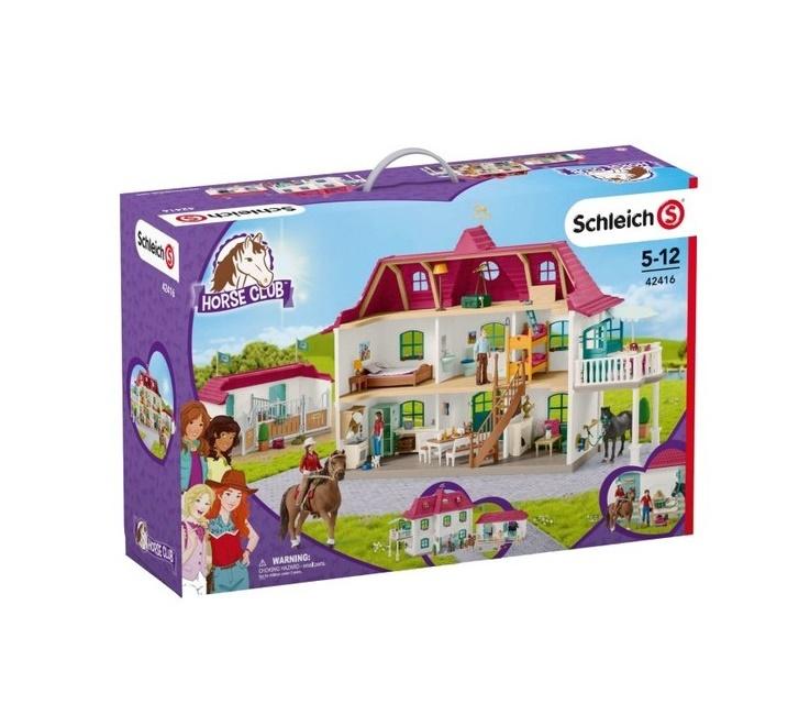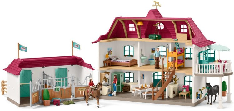 Zawartość zestawu: 1 x dom, 1 x stadnina koni, 1 x balkon, 1 x dziewczyna, 1 x matka, 1 x ojciec, 1 x Quarter Horse Cayenne, 1 x hanowerski ogier Jupiter, 2 x kotek, 1 x podwójne łóżko z materacem, 2 x łóżko piętrowe z materacami, 1 x piętrowe łóżko, 4 x koce tkaniny, 6 x poduszka z tkaniny, 1 x stolik nocny, 1 x lampka nocna, 1 x toaleta, 1 x umywalka, 1 x prysznic, 2 x ława, 1 x kuchnia jednostka, 1 x lodówka, 1 x garnek, 1 x patelnia, 1 x pojemnik na owoce, 4 x butelka, 4 x talerz, 4 x kubki, 4 x kawałek szarlotki, 1 x stół jadalny, 1 x stojak na talerze, 1 x schody, 1 x komin, 1 x drewniany stos, 1 x lampa podłogowa, 1 x futerał, 1 x teleskop, 2 x krzesło balkonowe, 1 x stolik balkonowy, 1x parasol słoneczny, 3 x kwietnik z kwiatami, 1 x stolik kawowy, 1 x sofa, 1 x doniczka, 1 x bukiet kwiatów, 1 x miska dla kota, 1 x złoty klucz, 1 x marchewka, 1 x piekarnik, 2 x żłobie, 2 x koryto, 2 x uchwyt na siodło, 4 x padoki, 1 x pudło pielęgnacyjne, 1 x grze w curry, 1 x szczotka końska, 2 x jabłka, 1 x widły, 1 x siodło, 1 x uzda i lejce, 2 x siano, 3 x rozetki, 1 x trofeum, 1 x mi niderlandzka osłona dla świń, 2 x bukszpan w wannie, 1 x wiatrowskaz koni, 2 x flaga, 1 x studzienka, 1 x uchwyt węża z wężem wodnym, 1 x naklejka, 1 x instrukcja montażu Wiek od 5-12 lat.