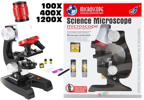 MIKROSKOP DLA MAŁEGO NAUKOWCA+ AKCESORIA Soczewki w mikroskopie dają powiększenie 100x 400x 1200x W skład zestawu wchodzi: - mikroskop - pęseta - gotowy preparat na szkiełku - 4 szkiełka do przygotowania preparatów - 2 probówki - pudełeczko - naklejki Mikroskop zasilany jest bateriami 2xAa brak w zestawie Posiada żaróweczkę podświetlającą preparaty