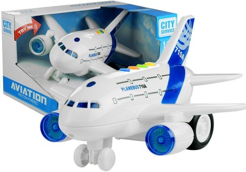 Duży samolot Aviation z dźwiękami i światłem Samoloty są zabawkami, które uwielbia większość dzieciaków. Zabawki te pozwalają im na aranżowanie bardzo ciekawych, rozwijających i przede wszystkim długich zabaw. Te maszyny powietrzne pomogą w prosty sposób wytłumaczyć dziecku, na jakiej zasadzie samoloty unoszą się na niebie. Biały samolot Aviation utrzymany jest w jasnej kolorystyce, połączonej z czarnymi i granatowymi detalami — odznacza się światłami w kabinie oraz w silnikach, a także napisami i ozdobnymi elementami na kadłubie pojazdu. Zabawka ta znajduje się na dużych, czarnych kołach posiadających napęd typu fiction, oraz mniejszych, plastikowych, umożliwiających swobodną jazdę oraz zabawę samolotem na różnych, gładkich nawierzchniach. Zabawkowy samolot pasażerski jest lekki, acz solidny i odporny na zniszczenia mogące wystąpić podczas intensywnej zabawy. Samolot dla dzieci wyposażony jest w cztery różne guziki, aktywujące interesujące dźwięki i światła. Po naciśnięciu każdego z nich dziecko usłyszy dźwięki związane z lotnictwem, a także komunikat w języku angielskim, co połączone jest ze spektakularnym efektem świetlnym. Zabawka wykonana jest w skali 1:120, co sprawia, że wygląda niesamowicie realnie, zachęcając tym dzieci do podjęcia zabawy. Samolot pasażerski zasilany jest 2 sztukami baterii AAA, które są dołączone do zestawu. Zabawka posiada certyfikat CE, wykonana jest z bezpiecznego dla dzieci, solidnego i trwałego materiału, który jest gwarancją długiej żywotności. Przedmiot zapakowany jest w estetyczne pudełko z witrynką, co sprawia, że będzie rewelacyjnym prezentem dla dziecka. Wymiary zabawki: - 30 cm x 31 cm x 18 cm cm. Wymiary opakowania: - 32 cm x 24, 5 cm x 18,5 cm.