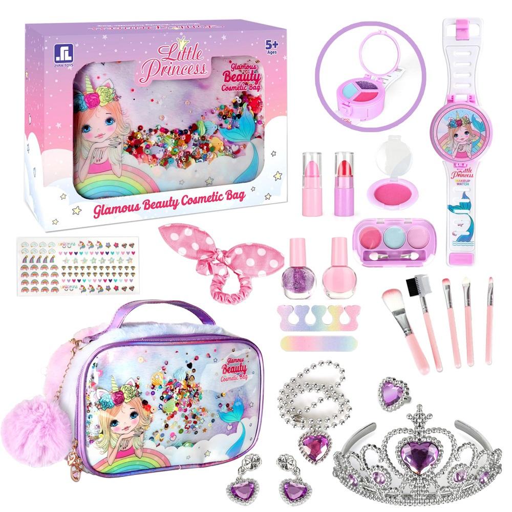Zestaw składa się z dwóch lakierów, dwóch szminek, błyszczyku, cieni do powiek, zegarka z cieniami, naklejkę, pilniczka, separatora do malowania paznokci, gumki do włosów, pięciu pędzelków do nakładania makijażu, korony, klipsów, pierścionka i naszyjnika oraz pięknej kosmetyczki z przywieszką. Wymiary opakowania: 21.5 x 8.7 x 15.5 cm