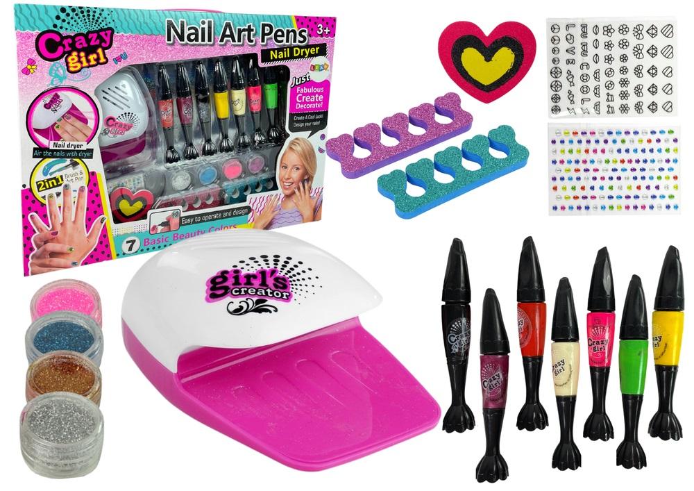 Duży Zestaw Do Malowania Paznokci Pisaki Brokat Przedstawiamy zestaw kosmetyczny, który jest idealnym rozwiązaniem dla wszystkich mam, których córki zbierają kosmetyki, a przede wszystkim przepadają za lakierami do paznokci - własny zestaw do manicure. Wielokolorowy zestaw innowacyjnych lakierów do paznokci w formie pisaków i brokatów z suszarką do paznokci podbije serce wszystkich dziewczynek. Klasyczne, modne kolory i brokatowe naklejki pozwolą Ci stworzyć piękny manicure, który można szybko i bezinwazyjnie usunąć zwykłym zmywaczem do paznokci. Jak używać tych lakierów i innych akcesoriów? Po wyrównaniu długości i kształtu paznokci za pomocą pilnika diamentowego, nałóż na paznokcie wybrany kolor. Kolejnym krokiem jest umieszczenie rączki w specjalnej lampie przeznaczonej do paznokci. Po włożeniu uchwytu lampka świeci jak w prawdziwym odpowiedniku. Pisaki pozwolą na precyzyjne malowanie wzorów, występują w dwóch kolorach. Malując wzory, dziewczynka rozwija precyzję i tworzy swój własny styl. Naklejki, diamenciki i brokaty dodadzą oryginalności i blasku. Gotowy manicure będzie wyglądał zjawiskowo i oryginalnie! Stwórz swój własny styl! Zestaw zawiera: - lampa do paznokci - 4 kolory lakierów do paznokci: różowy, biały, zielony, żółty, czarny, czerwony, ciemny róż - brokatowy separator do palców - różowy i zielony - pilnik do paznokci w kształcie diamentu - cztery błyszczyki: srebrny, różowy, niebieski, ciemnoróżowy Lakiery wchodzące w skład zestawu wykonane są ze zdrowych, nieszkodliwych i nietoksycznych substancji, dzięki czemu nie wyrządzą krzywdy paznokciom dziewczynek. Wymiary lampy: 10 cm x 13 cm x 8 cm Wymiary opakowania: 46 cm x 33 cm x 7 cm Suszarka zasilana za pomocą 2 baterii AA 1,5V. Dla dzieci powyżej 3 roku życia. Zabawka zgodna z normą EN71.
