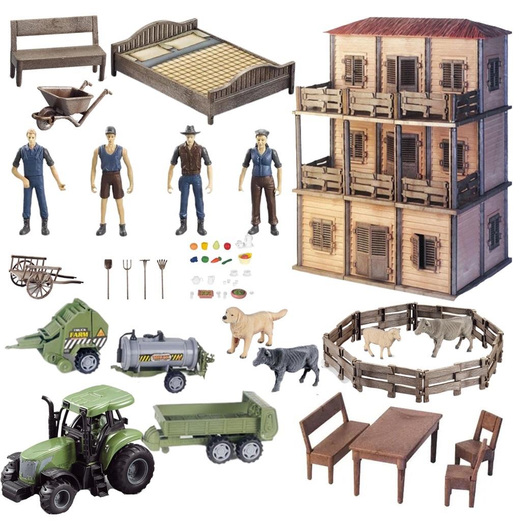 Traktor to niezbędny sprzęt na farmie. Dziecko może nim przewozić zwierzęta, przyczepiać wózek budowalny i wykonywać różne prace rolnicze. Zestaw zawiera narzędzia rolnicze, takie jak łopata, widły i grabie. Dzięki nim można pomóc w pracach na farmie i utrzymać ją w doskonałym stanie. Oprócz tego na farmie znajdują się taczki, wózek.