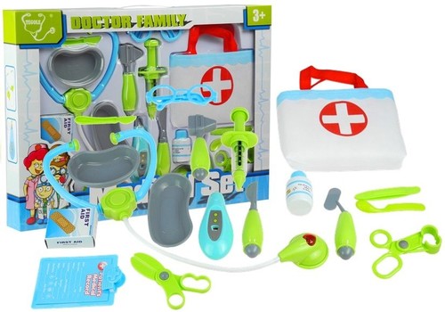 Zabawa w lekarza to świetny sposób, aby dziecko nauczyło się udzielać pomocy innym, a także sposób na pozbyło się lęku przed lekarzem. Zestaw zawiera: - stetoskop (podczas badania miga serduszko i słychać odgłos bicia serca) - termometr z regulacją (wyświetla temperaturę pacjenta) - młoteczek - strzykawka - lusterko laryngologiczne - torebka - lekarska plakietka -pudełko imitujące zestaw plastrów -okulary -nożyczki -2 miski i inne Przedstawione instrumenty medyczne są imitacjami prawdziwych przyrządów lekarskich, którym nadano przyjazne kształty i żywe kolory. Zabawa w lekarza to świetny sposób, aby dziecko nauczyło się udzielać pomocy innym, a także sposób na pozbyło się lęku przed lekarzem.