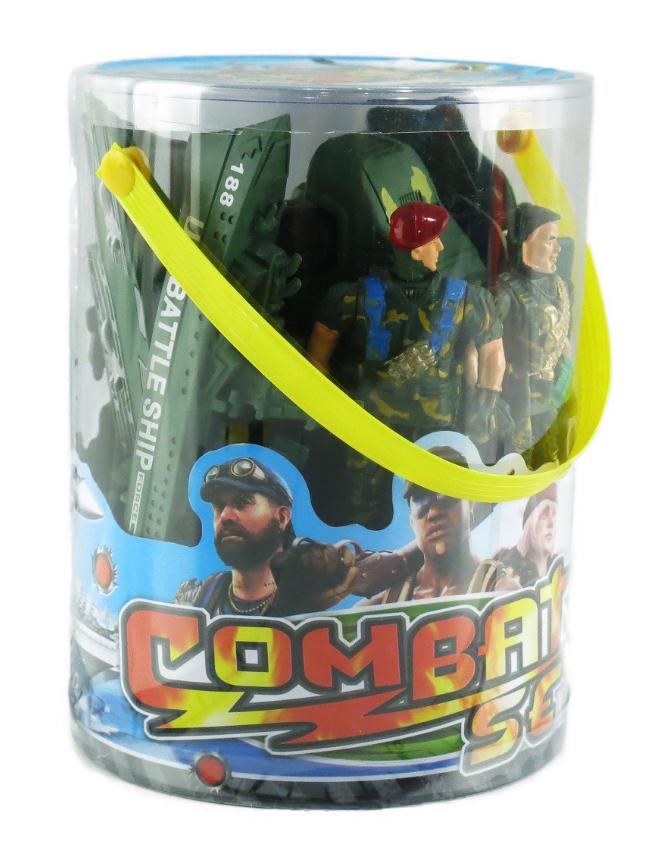 Duży zestaw plastikowych pojazdów i figurek z militarnej serii COMBAT w praktycznej tubie.