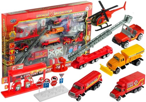 Zestaw pojazdów strażackich + akcesoria w skali 1:64 Ten zestaw będzie wielką gratką dla wszystkich młodych fanów dzielnych i nieustraszonych strażaków. Zestaw składający się z imponującej liczby 30 elementów skrywa w sobie zarówno różnorodne pojazdy, jak i elementy konieczne do aranżacji świetnej zabawy. Co ważne, samochody, znaki drogowe i pozostałe elementy wchodzące w skład kompletu inspirowane są realnymi, pełnowymiarowymi przedmiotami, przedstawionymi w skali 1:64. Zabawki wykonane są z połączenia plastiku i metalu, dzięki czemu są bardzo solidne, wytrzymałe, a zarazem bezpieczne w użytkowaniu. Całość zachowana jest w charakterystycznej dla straży pożarnej kolorystyce, składającej się z czerwonej barwy. W zestawie dziecko znajdzie elementy pozwalające na świetną zabawę — maluch będzie mieć do dyspozycji helikopter, naczepę z długą, wysuwaną drabiną, pięciu pojazdów, a także figurki strażaka i elementów bezpieczeństwa — pachołki i znaki drogowe. Dlaczego warto wybrać ten zestaw? Mnogość elementów wchodzących w skład tego kompletu umożliwia wspólną zabawę i pozwala na to, by dołączyły do niej inne dzieciaki bądź rodzeństwo — z pewnością będzie jeszcze bardziej pasjonująca, a jej scenariusz zaskakujący. Ponadto zawiera w sobie wszystko, co jest wymagane do udanej zabawy. Wymiary wybranych zabawek: - naczepa z drabiną: 17,5 cm x 5,5 cm, - drabina wysunięta: 29 cm, - ciężarówka: 10,5 cm x 5,5 cm, - samochód terenowy: 8 cm x 5 cm, - stacja paliw: 13 cm x 7 cm, - stojak ze znakami drogowymi: 11,5 cm x 4,5 cm. Wymiary opakowania: - 45 cm x 5,5 cm x 28,5 cm.
