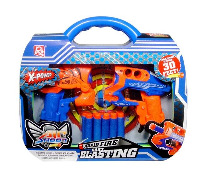 Zestaw dwóch pistoletów na strzałki. Każdy w innym kolorze do zabawy dla Twojego dziecka oraz jego przyjaciela. W ten sposób dzieci będą mogły bawić się jednocześnie. W zestawie oprócz dwóch pistoletów znajduje się również 10 strzałek i tarcza. Zabawka zapakowana w gustowną walizkę. Produkt dla dzieci od 6 lat.