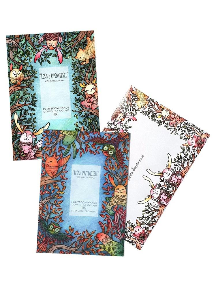 Zestaw kolorowanek złożony z tomów 1 i 2 z serii Leśne opowieści (""Leśne opowieści"" i ""Leśni przyjaciele"") zapakowanych w ozdobną kopertę. Wszystkie ilustracje powstały ręcznie, z najwyższą dbałością o szczegóły. Ich indywidualny styl sprawia, że jest to produkt wyjątkowy i niepowtarzalny. Cała seria została wydrukowana w Polsce, na papierze o gramaturze 200 g posiadającym certyfikat ekologiczny FSC. Kartki sklejone są tak, aby łatwo było je rozłożyć i w razie potrzeby wyrwać. Pokolorowany obrazek stanie się wtedy ozdobą ściany lub spersonalizowanym prezentem dla najbliższych. Kolorowanki Petite dominance to gwarancja wspaniałej, rozwijającą zabawy, która wciągnie na długie chwile i podbije serca dzieci i dorosłych!