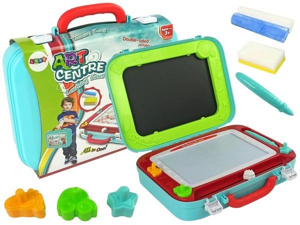 Po jednej tablicy można rysować kredą, natomiast po drugiej załączonym rysikiem. Rysunki można łatwo usunąć za pomocą suwaka u dołu. Dodatkowo 3 obrazki tworzą wzór dla małych artystów, a magnesiki w różnych wzorach będą uzupełnieniem dzieła. Wygodna walizka z rączką umożliwi zabranie ze sobą tablic i zabawy gdziekolwiek zechcesz.