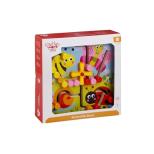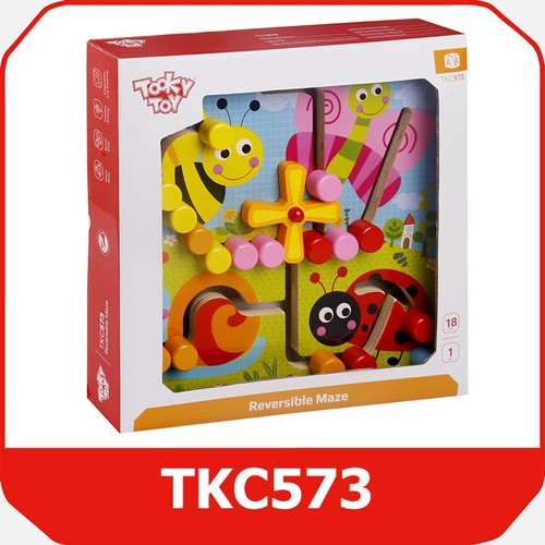 Dwustronny Labirynt to drewniana tablica ze specjalnie wyciętymi kanałami po których przesuwamy barwne koraliki. Każda ze stron tablicy ma inny wizerunek. Na jednej jest kolorowa łąka z wizerunkami: pszczółki, motylka, biedronki i ślimaka. Na drugiej stronie namalowane są kształty geometryczne: trójkąt, gwiazdka, koło i kwadrat. Dziecko może przesuwać koraliki tworząc własne wzory lub dopasować koraliki do kolorów pasujących do rysunków. Zabawa pozwala trenować logiczne myślenie i umiejętności rozwiązywania problemów. Pozna także kolory i nauczy się sprawnie poruszać rączkami przy przekładaniu koralików, które zamontowane są na stałe, dzięki czemu zabawka jest bezpieczna już dla maluchów od 18 miesiąca życia. Zabawki Tooky Toy są bezpieczne. Posiadają certyfikaty ekologicznych produktów. Pozbawione ostrych krawędzi, dobrze wygładzone, pomalowane są nietoksycznymi farbami i lakierami. Wiek: 18 m+