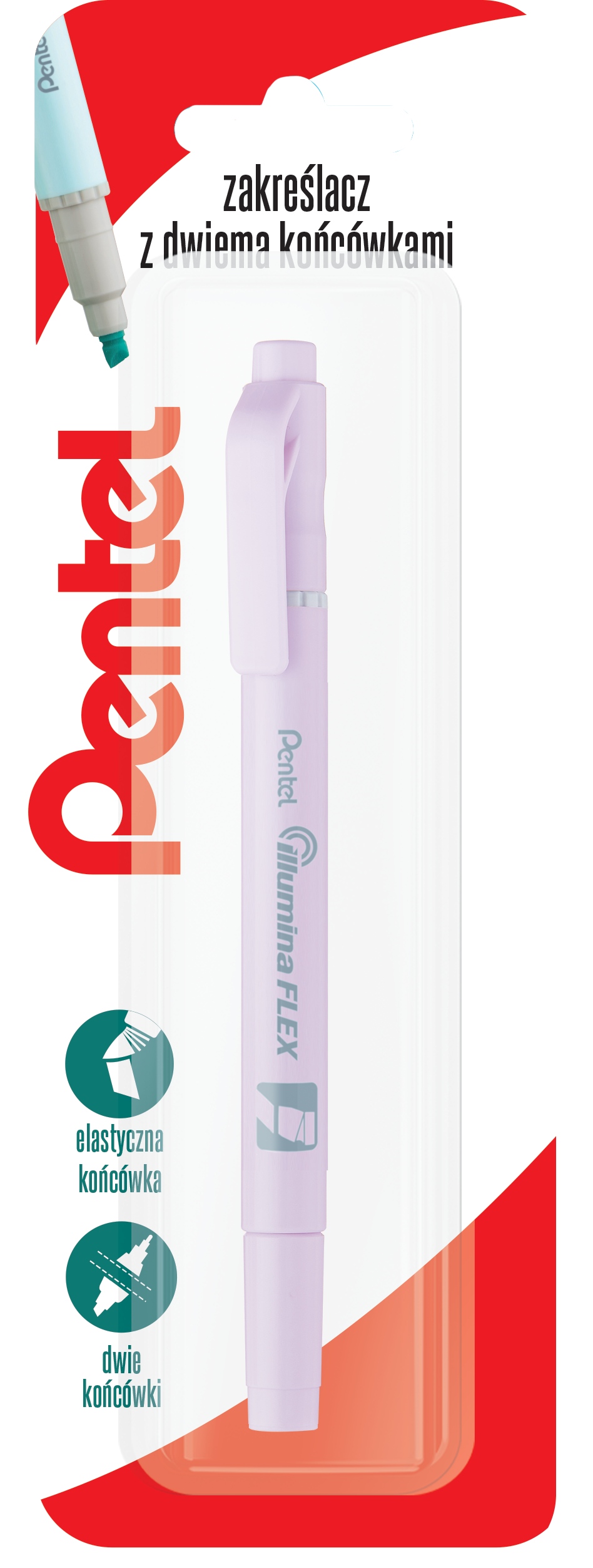 Dwustronny zakreślacz w pastelowych kolorach. Ścięta końcówka ugina się, aby elastycznie dopasować się do papieru, dzięki czemu linie są proste i czyste. Pastelowy fioletowy. Pakowany na blistrze x 1 sztuka.