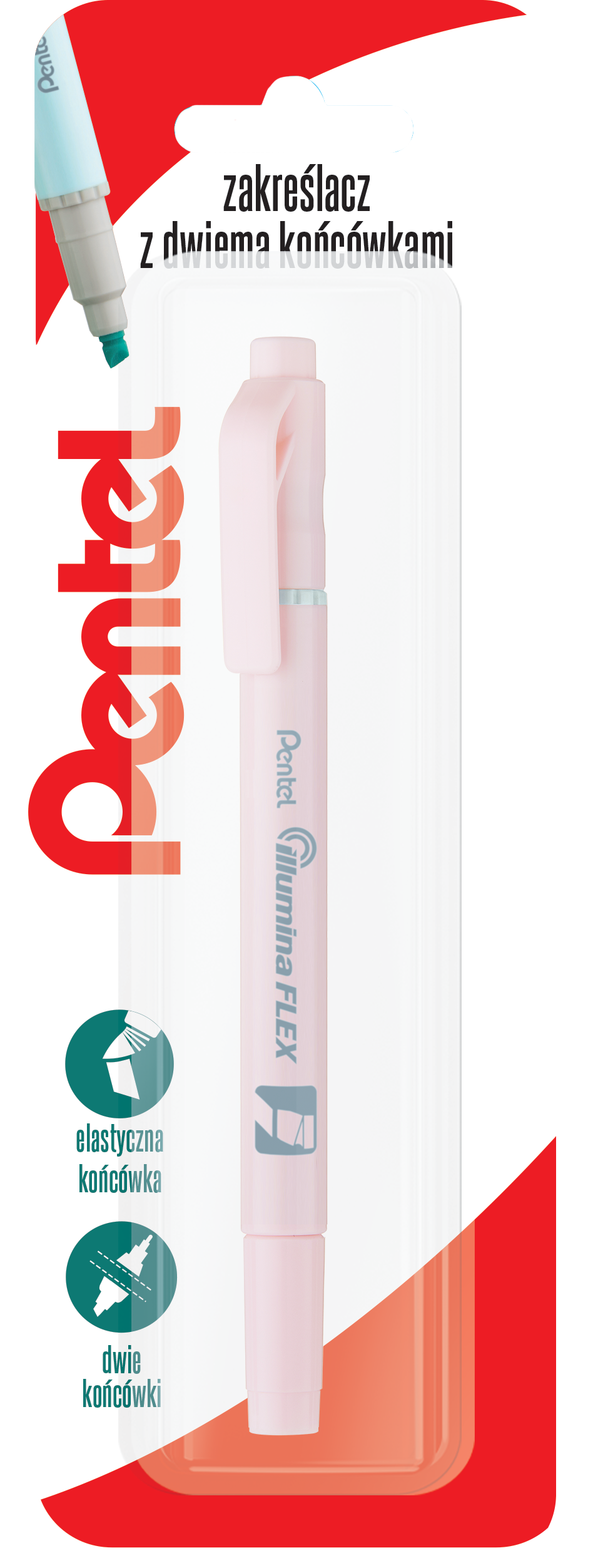 Dwustronny zakreślacz w pastelowych kolorach. Ścięta końcówka ugina się, aby elastycznie dopasować się do papieru, dzięki czemu linie są proste i czyste. Pastelowy różowy. Pakowany na blistrze x 1 sztuka.