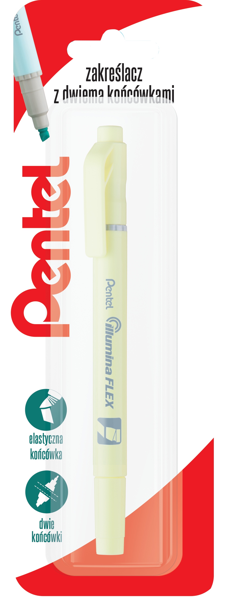 Dwustronny zakreślacz w pastelowych kolorach. Ścięta końcówka ugina się, aby elastycznie dopasować się do papieru, dzięki czemu linie są proste i czyste. Pastelowy żółty. Pakowany na blistrze x 1 sztuka.