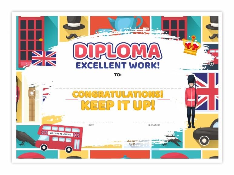 Dyplom językowy idealnie sprawdzi się jako pamiątka oraz nagroda za postępy i ciężką pracę w nauce języka angielskiego.