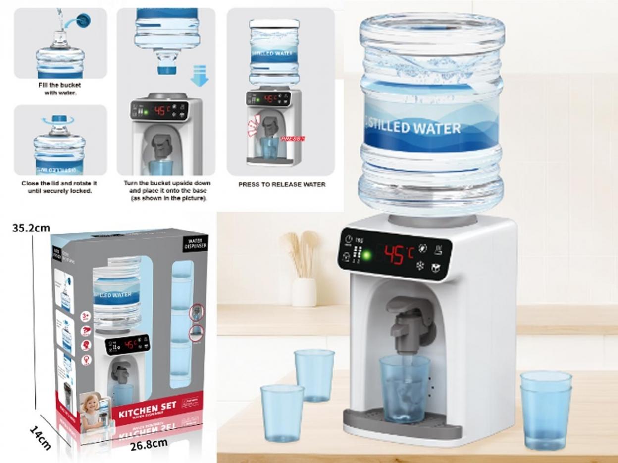 Realistyczny dystrybutor wody w wersji dziecięcej to świetne uzupełnienie zabawy w dom i kuchnię. Zabawka posiada zbiornik na wodę oraz przycisk do nalewania, dzięki czemu dziecko może samodzielnie napełniać kubeczki jak prawdziwy dorosły. Nowoczesny panel z wyświetlaczem (imitacja temperatury 45C) oraz efekty świetlne dodają realizmu i uatrakcyjniają zabawę. Idealny zestaw do rozwijania wyobraźni, samodzielności i koordynacji ruchowej. Cechy produktu: możliwość nalewania prawdziwej wody; realistyczny wygląd i panel z wyświetlaczem; łatwy montaż zbiornika (odwracany pojemnik); efekty świetlne; bezpieczna konstrukcja; dla dzieci 3+. Wymiary opakowania: Wysokość: ok. 35,2 cm; Szerokość: ok. 26,8 cm; Głębokość: ok. 14 cm.