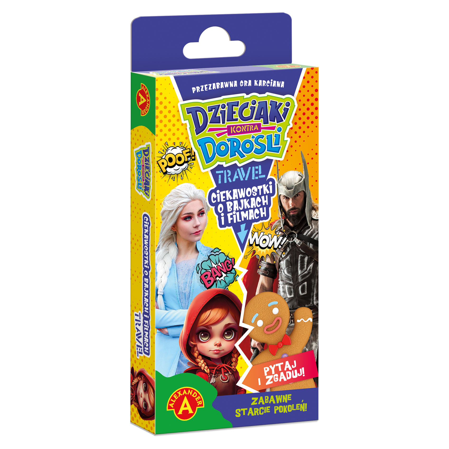 ""Dzieciaki Kontra Dorośli Ciekawostki o Bajkach i Filmach Travel"" to gra planszowa, która zapewni świetną zabawę całej rodzinie. Dzieci rywalizują z dorosłymi, odpowiadając na podchwytliwe pytania dotyczące świata baśni i filmów. Dzięki dwóm oddzielnym zestawom kart z pytaniami o innym poziomie trudności dedykowanym dzieciom oraz rodzicom, szanse na wygraną są takie same dla obu drużyn.