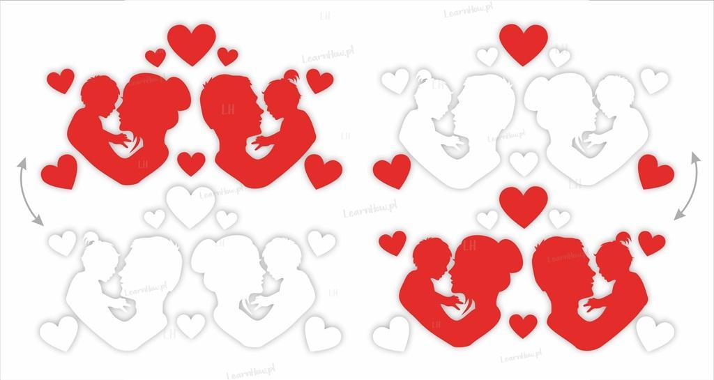 Zestaw składa się z 2 dużych postaci rodziców trzymających dzieci i 8 wyciętych serc - idealny do szkoły i przedszkola!