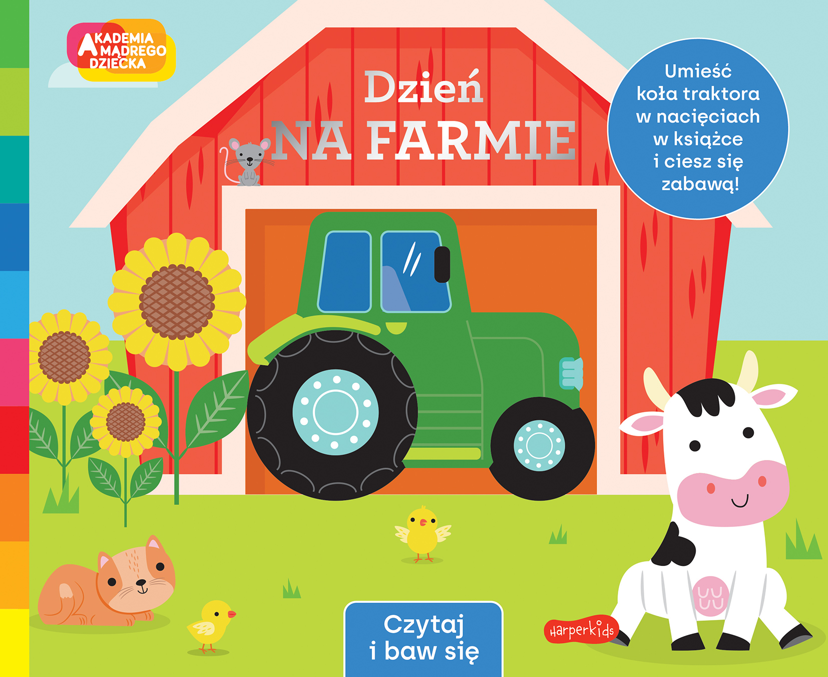 Dzień na farmie to filcowo-kartonowa książeczka w nowej serii Akademii Mądrego Dziecka Czytaj i baw się. Książeczka opowiada o tym co dzieje się na farmie. Zwiedzamy ją razem z traktorkiem, który dołączony jest do książeczki na tasiemce. Traktorek musimy wyciągnąć z okładki i postawić w odpowiednich nacięciach na środku pierwszej strony. Dzięki wycięciu w stronach traktorek jedzie z nami przez kolejne strony książeczki. Razem z nim szukamy krówek wśród słoneczników, patrzymy kto wyjada rolnikowi marchewki w polu oraz poznajemy zwierzątka żyjące na wsi. Książeczka zachęca do wspólnej zabawy, duże, lekkie strony są idealne dla małych rączek do oglądania i przekładania, a stojący pojazd umili zabawę i wspólne czytanie.
