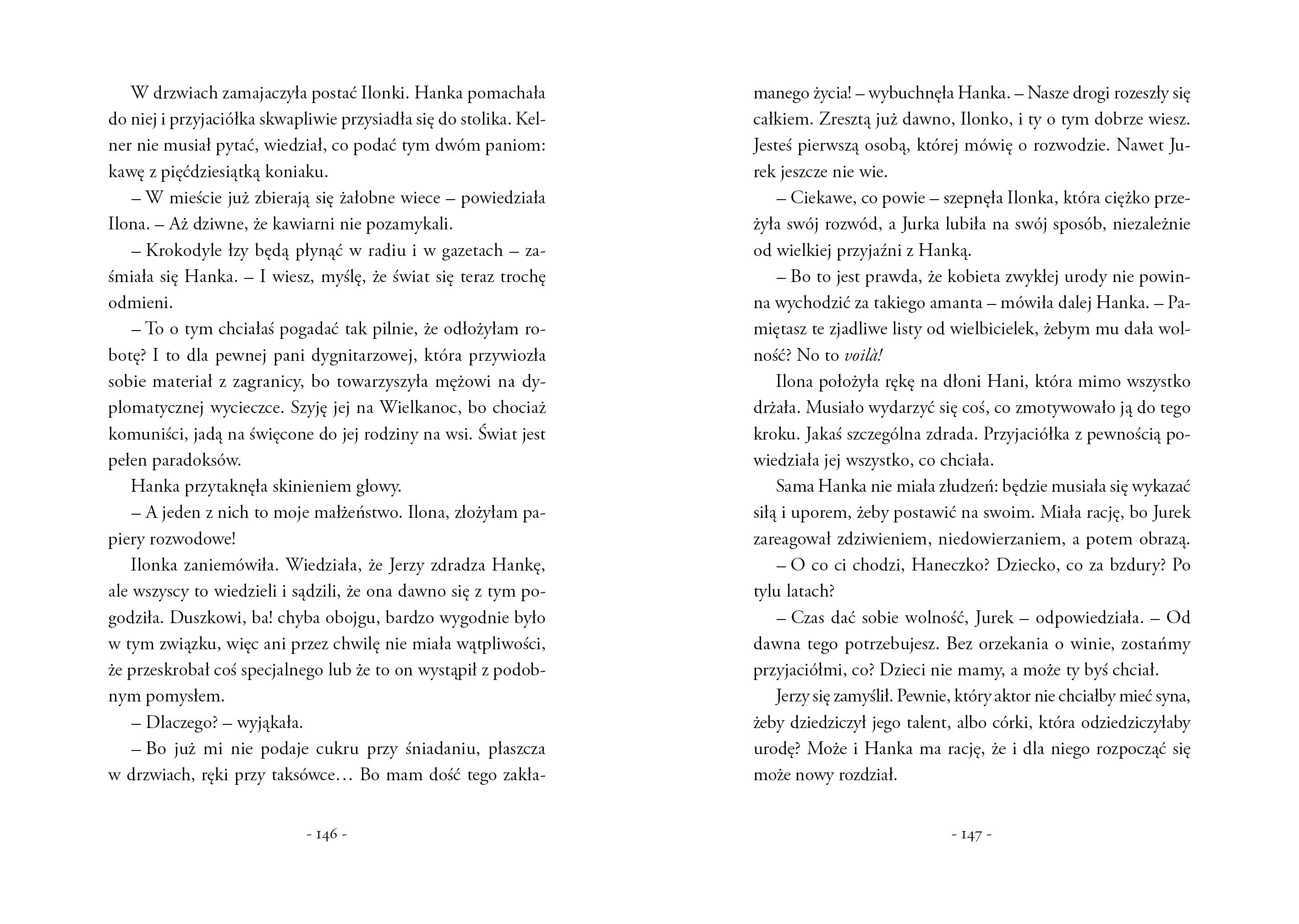 „Nie, nie, nie! Jeszcze raz nie! Przerwijcie to, proszę, zabierzcie tego krokodyla, bo tu umrę ze śmiechu! Następna studentka proszę!” Hanka zbiegła ze sceny i ze łzami w oczach rzuciła się na krzesło w garderobie. Płakała jak nigdy w życiu. Nie o tym marzyła, kiedy w tajemnicy przed ojcem zdawała egzaminy do szkoły teatralnej. Przy jej nazwisku pojawiła się wówczas adnotacja: „aktorka charakterystyczna”. Cóż z niej za aktorka? Wychodzi na scenę i wszyscy w śmiech! A jednak Hanka udowodniła, że warto sięgać po to, czego się pragnie. I nie przeszkodziły jej w tym ani duży nos, ani „głos jak z baru”. Dziunia, ale dama to opowieść o królowej polskiego kabaretu Hance Bielickiej, a jednocześnie wspaniały obraz epoki, przez którą przewijają się legendy polskiej sceny: Danuta Szaflarska, Jerzy Duszyński, Irena Kwiatkowska, Aleksander Zelwerowicz, Marek Hłasko, Helena Buczyńska, Hanka Ordonówna. To powieść o dziewczynie, której wszystkiego było w życiu mało. FRAGMENT KSIĄŻKI: Hanka istotnie wyrastała na gwiazdę Syreny, i miała właściwie tylko jedną rywalkę – Irenę Kwiatkowską. Poznały się dawno, w Siedmiu Kotach w Krakowie, i już wtedy Hanka wiedziała: Kwiatkowska to jest ktoś. Aktorka znakomita. Temperament, Hermenegilda Kociubińska. Och, gdybym ja miała taką wykreowaną dla siebie postać, myślała Hanka. Obie, zabawne na scenie, poza nią stawały się poważne i surowe. Obie też, w myśl zasad przedwojennej szkoły, ogromną wagę przykładały do profesjonalizmu, punktualności i przygotowania do roli. Publiczność je uwielbiała, one jednak darzyły się niechęcią. Plotkarze warszawscy powiadali, że to dlatego, że jeszcze w Krakowie Irenie spodobał się mąż Hanki. Cóż, Jerzy podobał się, jak wiadomo, wszystkim, więc nie byłoby w tym nic dziwnego. Irena jednakże wyszła wtedy za mąż za spikera Kielskiego, który się dla niej rozwiódł i obecnie uchodzili za szczęśliwą i wzorowa parę. Co to w ogóle za bzdury? – myślała Hanka, jadąc do teatru. Mijało dziesięć lat istnienia Syreny i właśnie miały razem wystąpić w jubileuszowej rewii. - Warto byłoby zakopać topór wojenny, jak to mruknął pod nosem Jurandot. Ale jaki topór? Nigdy się nawet się nie pokłóciłyśmy! Co było, to było, nie ma sensu pielęgnować uraz. Nadchodzą wspólne próby. Pierwsza wyciągnę rękę! Z tym postanowieniem weszła do garderoby. Irena już była, malowała sobie oczy. – Dzień dobry pani – powiedziała Hanka, siadając przy sąsiednim lustrze. – Dzień dobry pani – odpowiedziała Kwiatkowska. Hankę pochwyciła impulsywna chęć, by powiedzieć: „A może po tylu latach znajomości, ba, nawet grywania w sztukach, będziemy mówić sobie na ty?”. Ale kiedy odwróciła się ku Irenie, ta zmierzyła ją lodowatym wzrokiem, po czym wstała i wyszła. Czy rzeczywiście przed laty romansowała z Jerzym? Czy możliwe, że miała do niej żal, że to ona jest żoną amanta? Może rzeczywiście coś jest ze mną nie tak, rozmyślała Hanka. Że też te baby taką wagę przykładają do wzdychań i pocałunków, i chcą pojawiać się w SPATIF-ie pod rękę z przystojnym mężczyzną i miną „mój ci on!”. Sama nie uważała się za piękność, ale z pewnością wciąż była interesująca i niejeden kolega chętnie by jej to powiedział. Na przykład Tadzio Pluciński. Młody aktor nie krył zachwytu Bielicką i starał się często być w zasięgu wzroku starszej koleżanki. Śmiała się z tego. Nie miała ochoty na żadne romanse, a romanse Jerzego nie wstrząsały nią tak, jak powinny. Ale Kwiatkowska? Nie to niemożliwe. Zresztą nawet gdyby – oddałaby jej męża za palmę pierwszeństwa w teatrze… I nagle Hanka uświadomiła sobie, że jeśli chodzi o Kwiatkowską, to o wiele bardziej zazdrosna jest o publiczność niż o męża. Publiczność Syreny, jej śmiech, oklaski i uwielbienie były dla niej większą wartością nić wierność Jurka. Powyższy opis pochodzi od wydawcy.