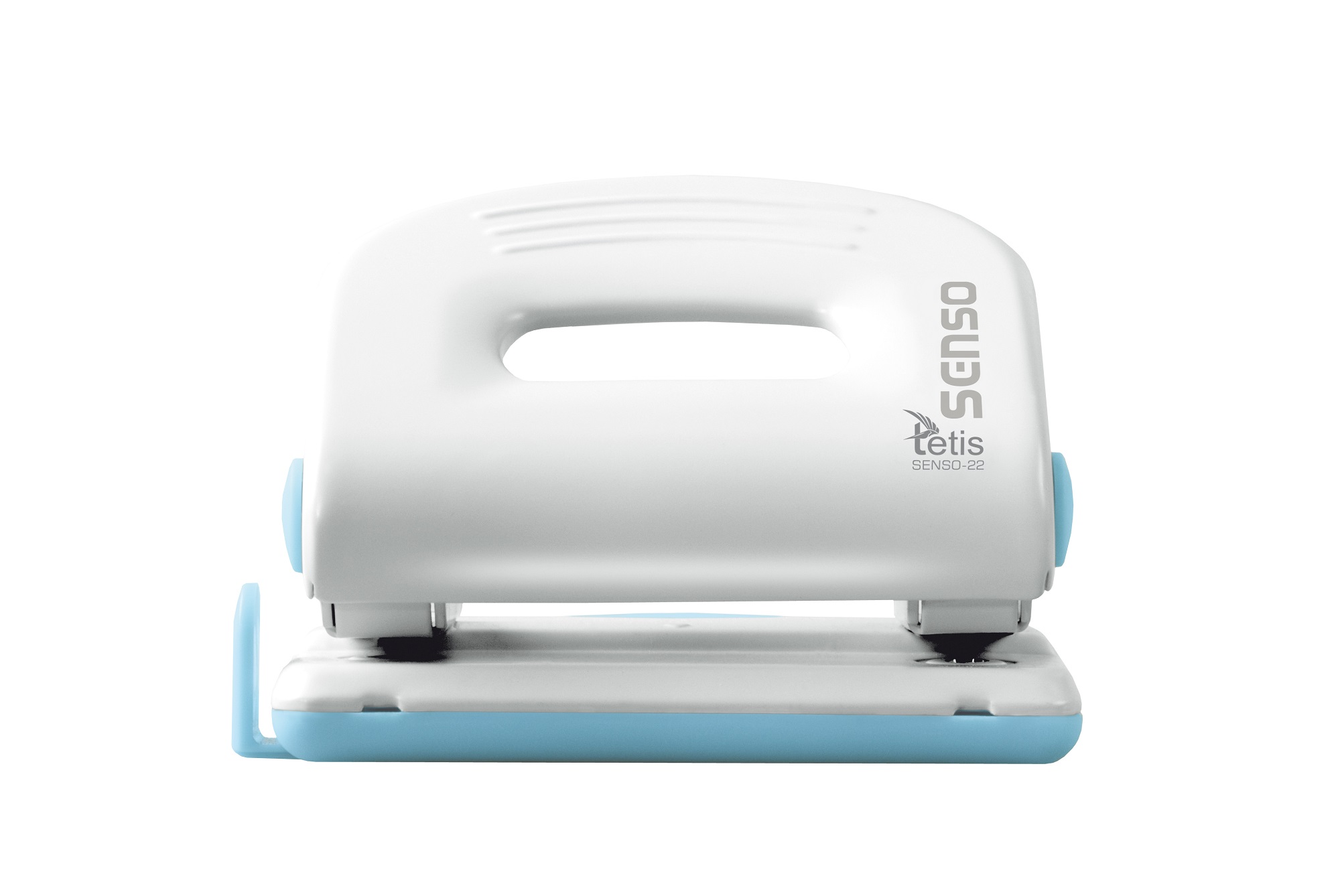 Metalowy dziurkacz biurowy z wykończeniami z tworzywa sztucznego. Kolor niebieski. Posiada wskaźnik środka strony i ogranicznik formatu. Dziurkuje do 25 arkuszy. Średnica otworu 6 mm. Rozstaw dziurek 80 mm. Głębokość wsuwania kartek 12 mm. Nowatorskie rozwiązanie umożliwia usunięcie konfetti bez zdejmowania całego spodu.