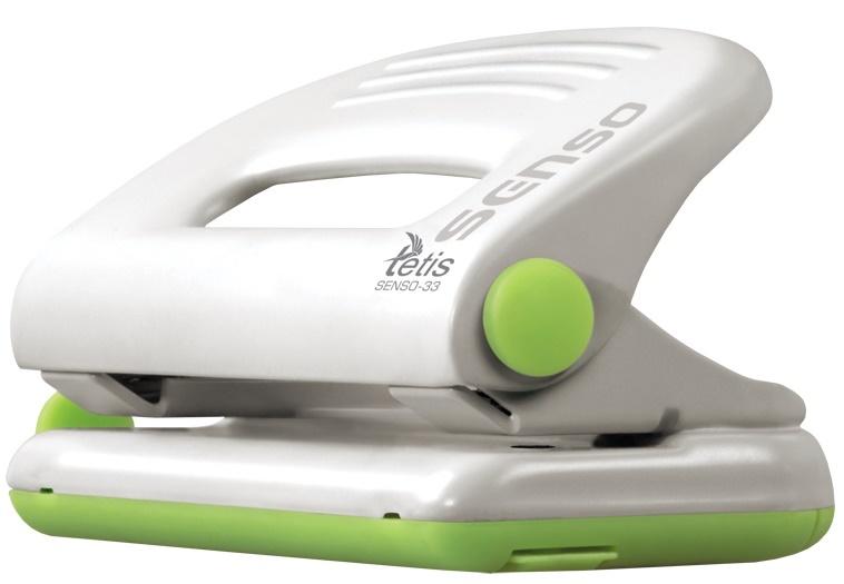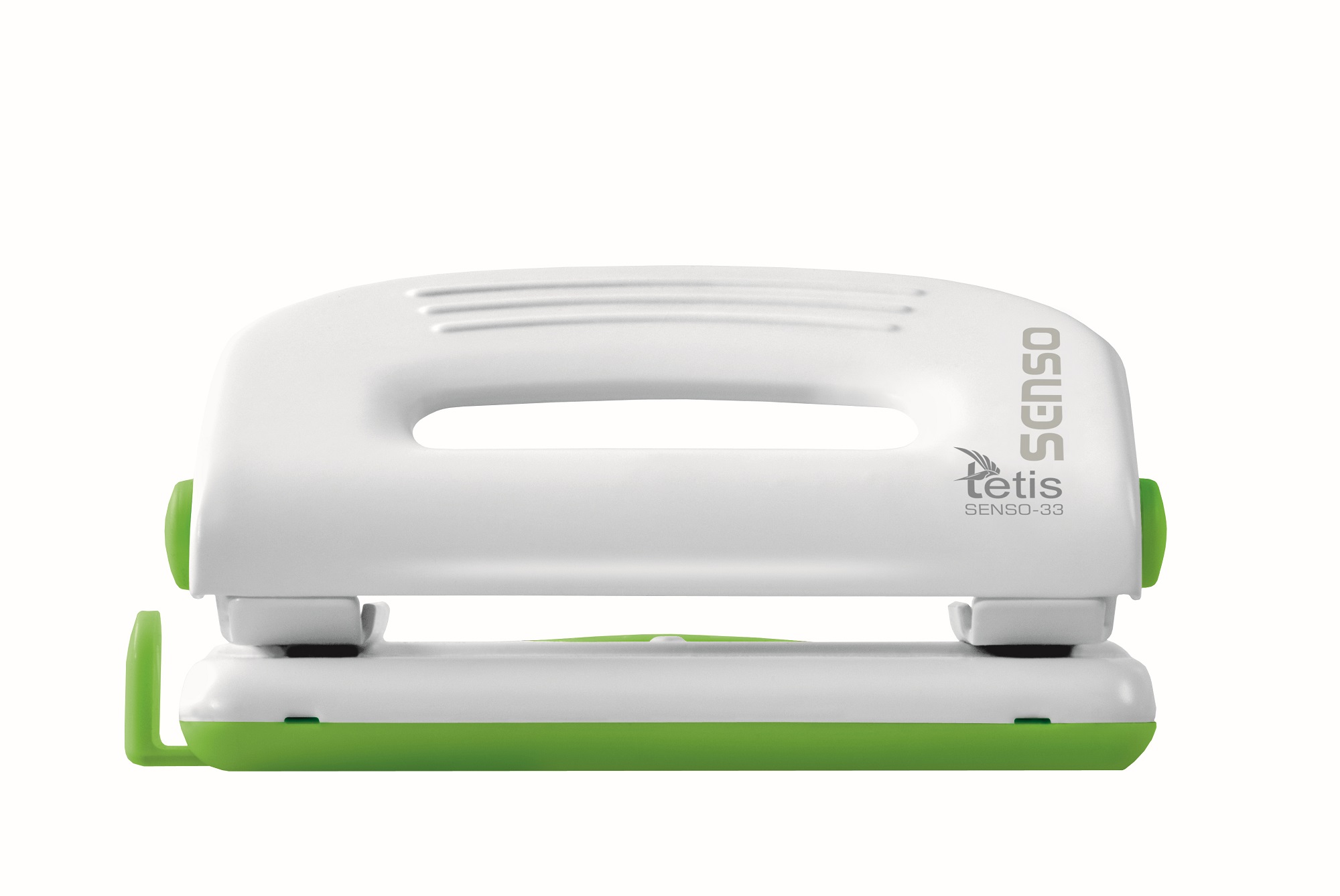 Metalowy dziurkacz biurowy z wykończeniami z tworzywa sztucznego. Kolor zielony. Posiada wskaźnik środka strony i ogranicznik formatu. Dziurkuje do 10 arkuszy. Średnica otworu 6 mm. Rozstaw dziurek 80 mm. Głębokość wsuwania kartek 12 mm. Nowatorskie rozwiązanie umożliwia usunięcie konfetti bez zdejmowania całego spodu.