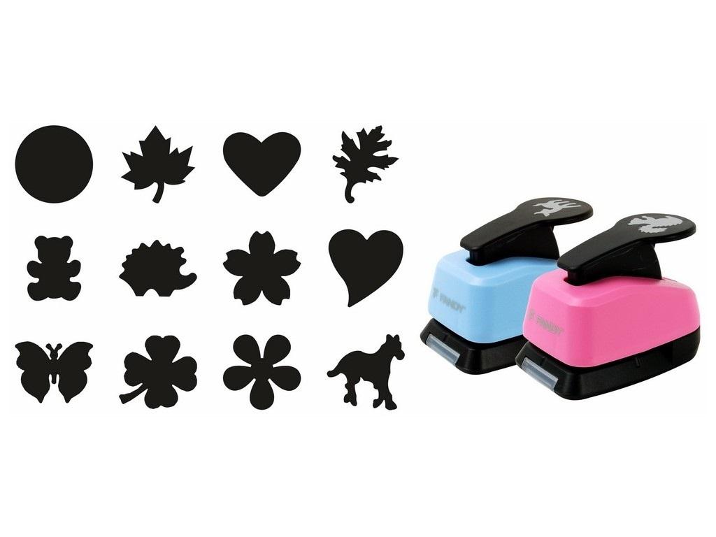 12 dziurkaczy ozdobnych z mechanizmem sprężynowym ułatwiającym pracę, odpowiedni również dla dzieci, wykrojnik może przecinać grubsze materiały, takie jak 2mm pianka i papier 300g, rozmiar wycięcia 25 mm, mix motywów i kolorów w opakowaniu zbiorczym