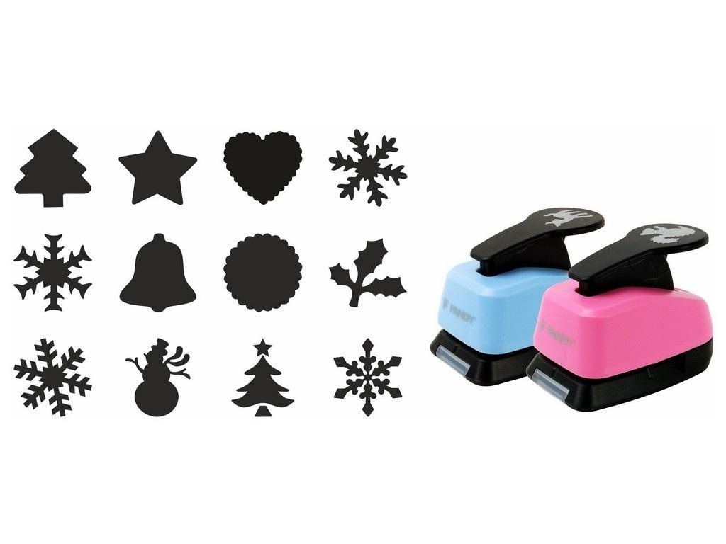 12 dziurkaczy ozdobnych z mechanizmem sprężynowym ułatwiającym pracę, odpowiedni również dla dzieci, wykrojnik może przecinać grubsze materiały, takie jak 2mm pianka i papier 300g, rozmiar wycięcia 25 mm, mix motywów i kolorów w opakowaniu zbiorczym