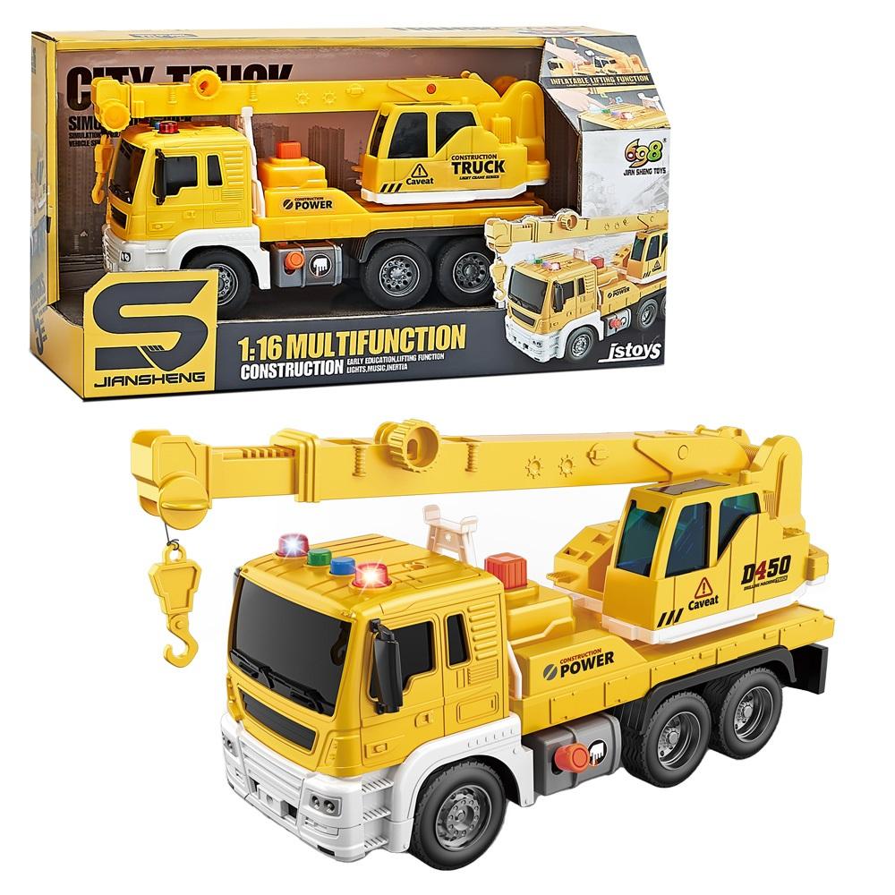 Dźwig z ruchomymi elementami. Dźwig podnoszony i opuszczany za pomocą przycisków. Efekty dźwiękowe i świetlne. Skala - 1:16 Wymagane baterie: 3xAG13 (dołączone)