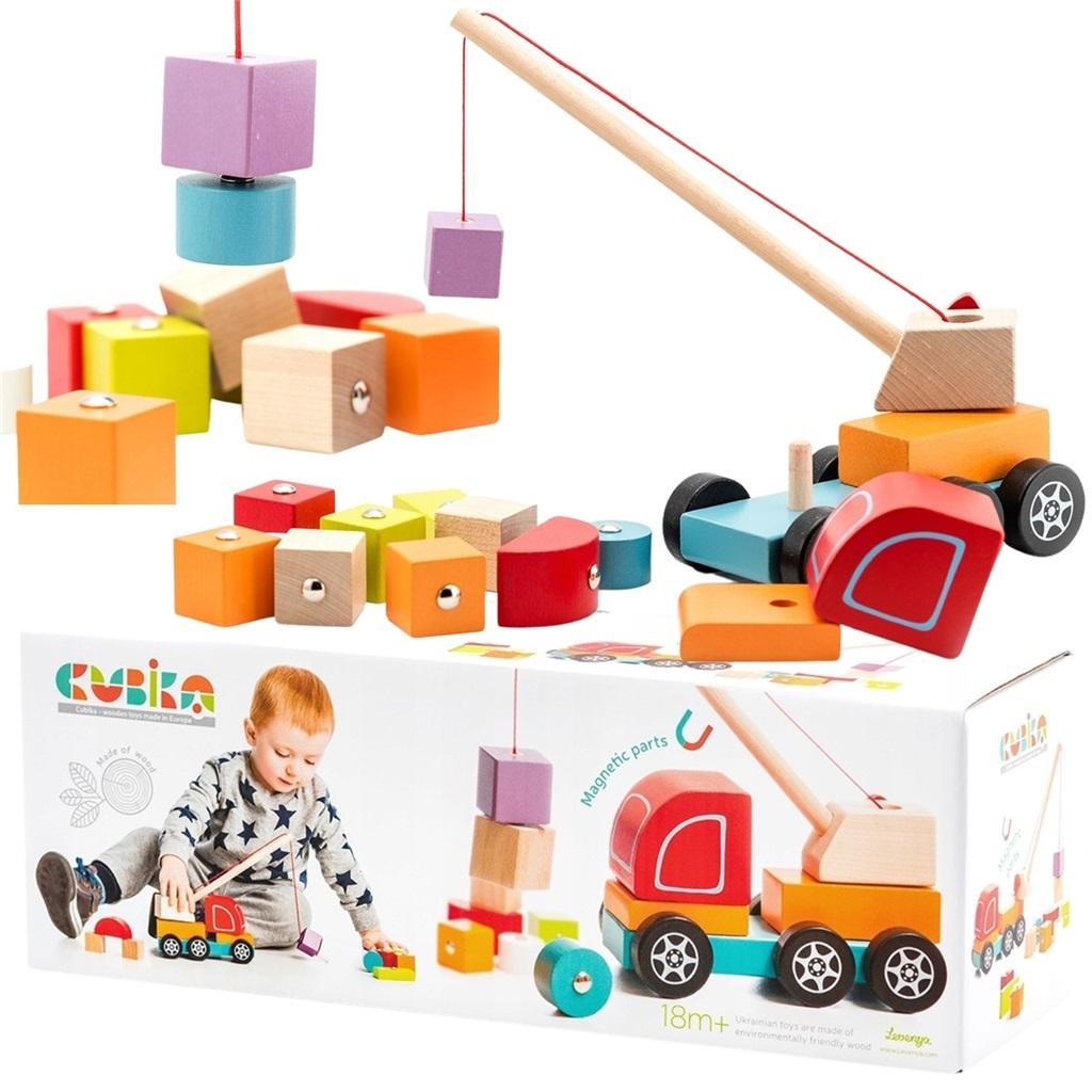 Drewniana zabawka edukacyjna DŹWIG od CUBIKA to14 częściowy zestaw zawierający samochód z żurawiem i wielokolorowe klocki.
