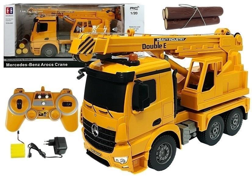 Dźwig Mercedes-Benz Arocs Zdalnie Sterowany Pilot 2.4G z Drewnem Przedstawiamy zdalnie sterowany Dźwig Mercedes Benz, który jest doskonałym prezent dla tych, którym zwykła jazda już nie wystarcza. Prezentowana zabawka może jeździć do przodu, do tyłu, skręcać na boki ale posiada także funkcją zdalnego sterowana wysięgnikiem i hakiem jak również obrót kolumny wysięgnika w zakresie 360 stopni. Krótko mówiąc mamy do czynienia z w pełni funkcjonalną maszyną, gotową do pracy. Rewelacyjne oświetlenie i koguty na dachu świetnie się prezentują w ciemniejszym pomieszczeniu. Podczas jazdy dźwig wydaje niezwykle realistyczny dźwięk syreny alarmowej. Pojazd zaopatrzony jest w ogromne 6 cm koła. Dodatkowym atutem urozmaicającym zabawę są dźwięki generowane przez model, działające światła oraz tryb demonstracyjny, zaprogramowana z góry sekwencja zachowania modelu. Warto także wspomnieć o systemie automatycznego wyłączania zabawki w przypadku długiej bezczynności, nie musimy się martwić, że pozostawiony w trakcie zabawy model rozładuje się do końca. Po uruchomieniu, słychać pracę silnika, palą się świtała z przodu i z tyłu w trakcie cofania. Cechy charakterystyczne: - Skala: 1:20 - Nadajnik: 27MHz - Czas ładowania: do 5 godzin - Czas zabawy: do 15 minut - Zasięg pilota: do 15 m - Długość wysięgnika: około 58 cm - Prędkość: około 2,5 km/h - Bardzo realistyczny odgłos pracy silnika w pojeździe - Podnoszenie i wysuwanie ramienia dźwigu - Obracanie korpusu o 360 stopni - Świecące światła w trakcie jazdy z przodu - Świecące światła podczas cofania z tyłu wraz z czujnikiem cofania - Świecące koguty z odgłosem syreny - Gumowe opony - Ustawienie zbieżności kół - Długość ramienia dźwigu około 51 cm - Długość liny z hakiem około 40 cm Elementy zestawu: - Dźwig Mercedes-Benz - Trzy drewniane bele - Pilot do zdalnego sterowania - Akumulator 4,8V 400mAh - Ładowarka do akumulatorka - Instrukcja obsługi Wymiary dźwigu: 39 cm x 21 cm x 14 cm Wymiary pudełka: 57 cm x 26.5 cm x 19 cm Dźwig zasilany jest akumulatorkiem 4,8 V (w zestawie), natomiast pilot do zdalnego sterowanie potrzebuje dwóch baterii AA 1.5 (brak w zestawie). Pojazd przeznaczony jest dla dzieci powyżej 6. roku życia. Zestaw zapakowany jest w kartonowe pudełko z przezroczystą witrynką, dzięki czemu idealnie nadaje się na prezent.