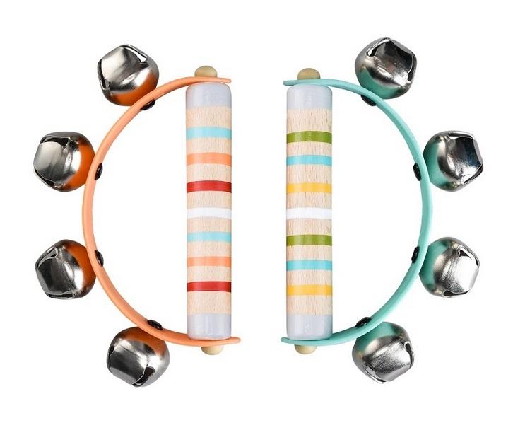 Metalowe dzwoneczki na drewnianym uchwycie wprowadzą dziecko w świat muzyki.