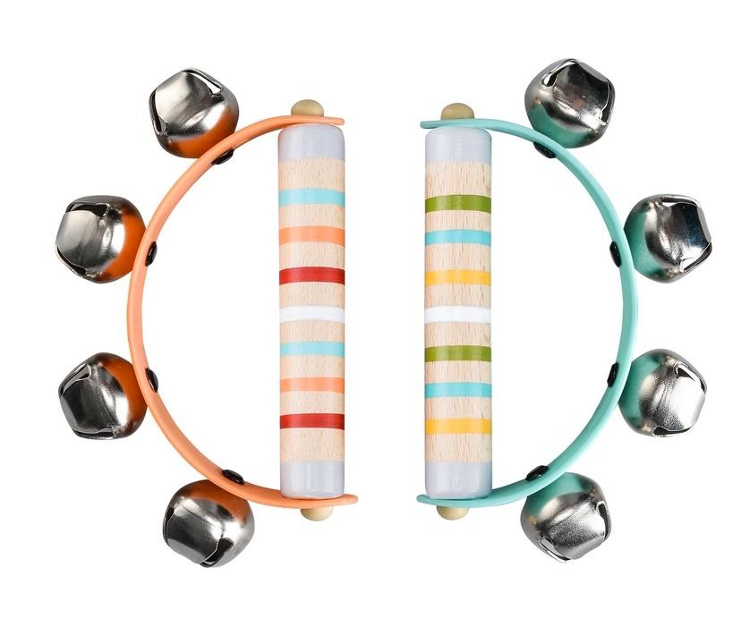Metalowe dzwoneczki na drewnianym uchwycie wprowadzą dziecko w świat muzyki.